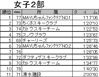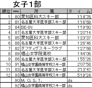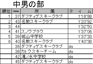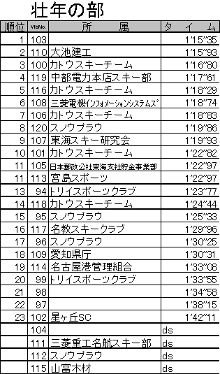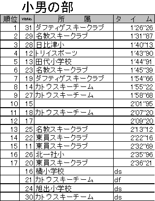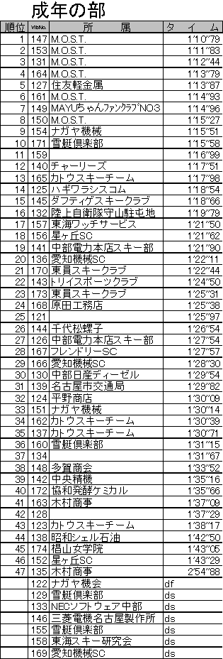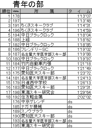 (1)期 日 平成17年2月20日(日) (2)会 場 岐阜県高山市 朴の木平スキー場 (3)大会時程 7:30〜9:00 受付 8:00 リフト運行開始 8:15〜8:45 コースインスペクション 9:00〜9:15 開会式 9:25 前走スタート 9:30 競技開始 11:30 競技終了 12:15 閉会式 (4)参加選手 エントリー総数205名 ,棄権(DS)40名,未完走(DF)1名,失格(DQ)1名 (5)概 況(大会当日の天候,コースの状態などについて) 前日降り続いた雨でコンディションの悪化が心配されましたが、大会当日は気温が下がり、硬くパックされたバーンが出来上がりました。また、天候も時折晴れ間がのぞく曇天で、気温が上昇しすぎることもなく大会を終えることができました。約160名の選手が滑りましたが、コースが大きく崩れることもなく、良いバーン状況の中で大会が進みました。現地朴の木平スキー場スタッフのみなさまには、コース設営からバーン維持まで多大なるご苦労があったことと思います。この場をお借りして御礼申し上げます。ありがとうございました。 *なお、大会役員の皆様には、交通費等の節減についてご理解と多大なご配慮を頂き誠にありがとうございました。 大会の様子(写真)はこちらへどうぞ (6)公式成績について(下記) 公 式 成 績 ※ただし、選手氏名の掲載は控えさせていただいております。 ジュリー 競技委員長 古茂田 潮 テクニカルデータ コース名:かもしか・アルペンコース 旗門数 40(40) 天候 曇 雪質 パック スタート時刻 9:30 小学生女子,小学生男子,中学生女子,中学生男子,マスターズ2,マスターズ1,女子2,女子1,壮年,成年,青年,少年